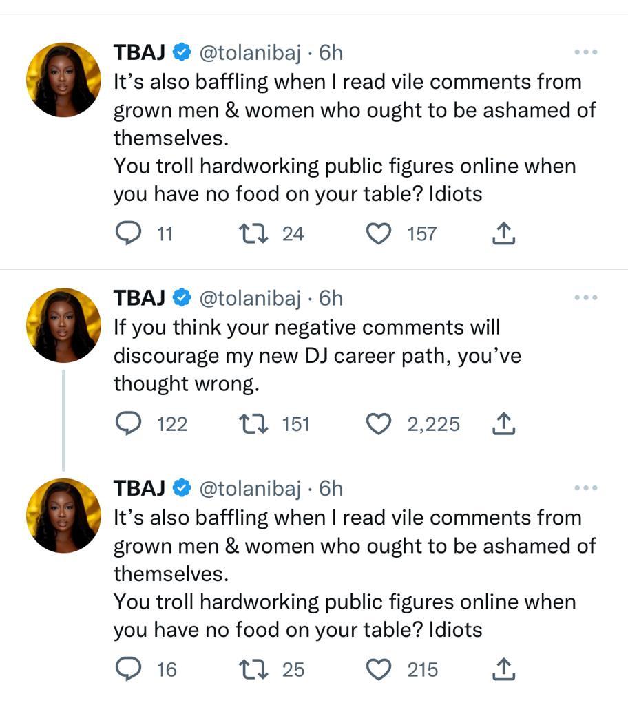 Reality Tv star cum Disc Jockey, Tolani Baj has slammed internet trolls for who have mocked her new career as a disc jockey.