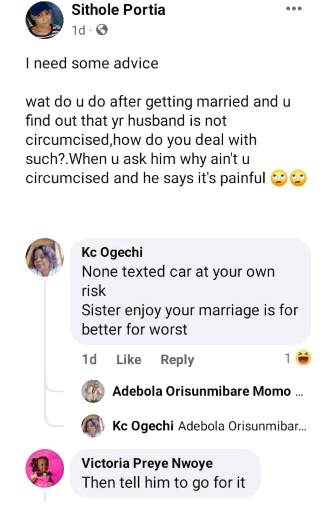 Nigerians have reacted differently after a woman sort to Facebook to seek advice after discovering that her husband is not circumcised.