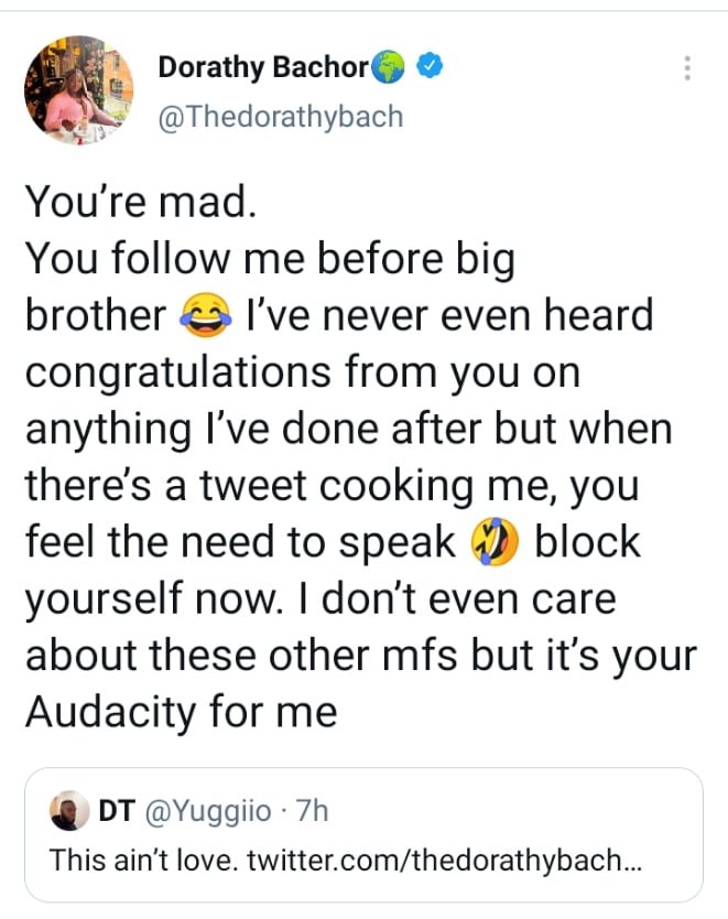 “You’re mad. You follow me before big brother 😂 I’ve never even heard congratulations from you on anything I’ve done after but when there’s a tweet cooking me, you feel the need to speak 🤣 block yourself now. I don’t even care about these other mfs but it’s your Audacity for me.”