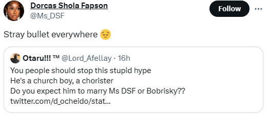Reacting, Dorcas Fapson alias Ms DSF expressed that stray bullet had hit her, and added an emoji showing how sad she is by what was said.