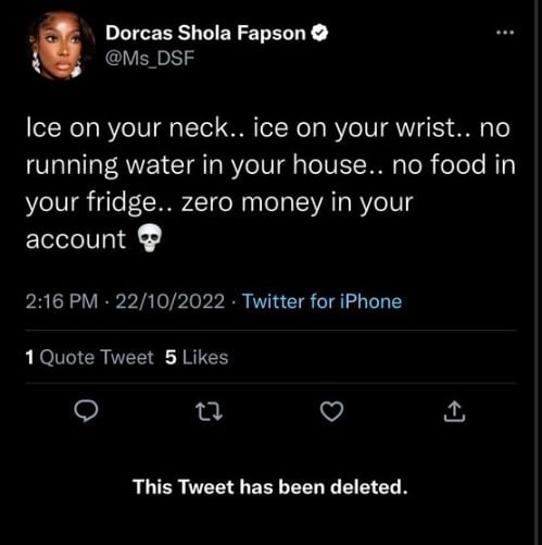 In a now-deleted Tweet, DSF, as she’s fondly called threw a shade at the “baddest boy” crooner for living a ‘fake life’.
