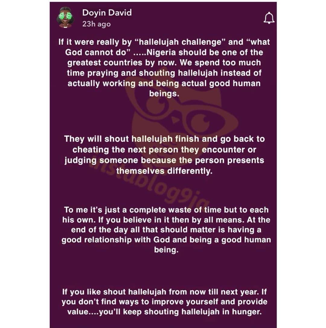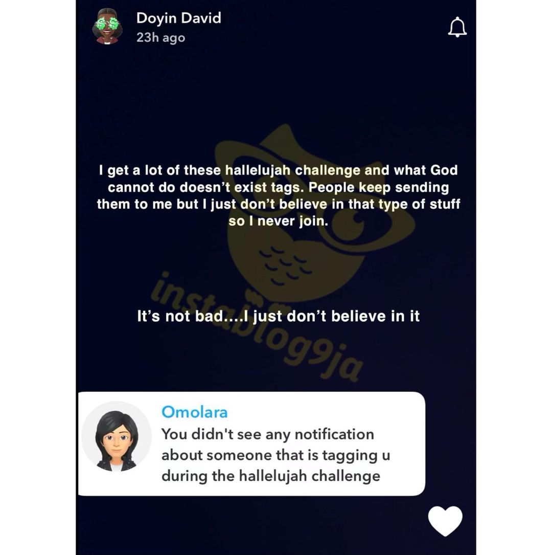 Doyin wrote: “I get a lot of those hallelujah challenge and what God cannot do doesn’t exist tags. People keep sending them to me but I just don’t believe in that type of stuff so I never join.