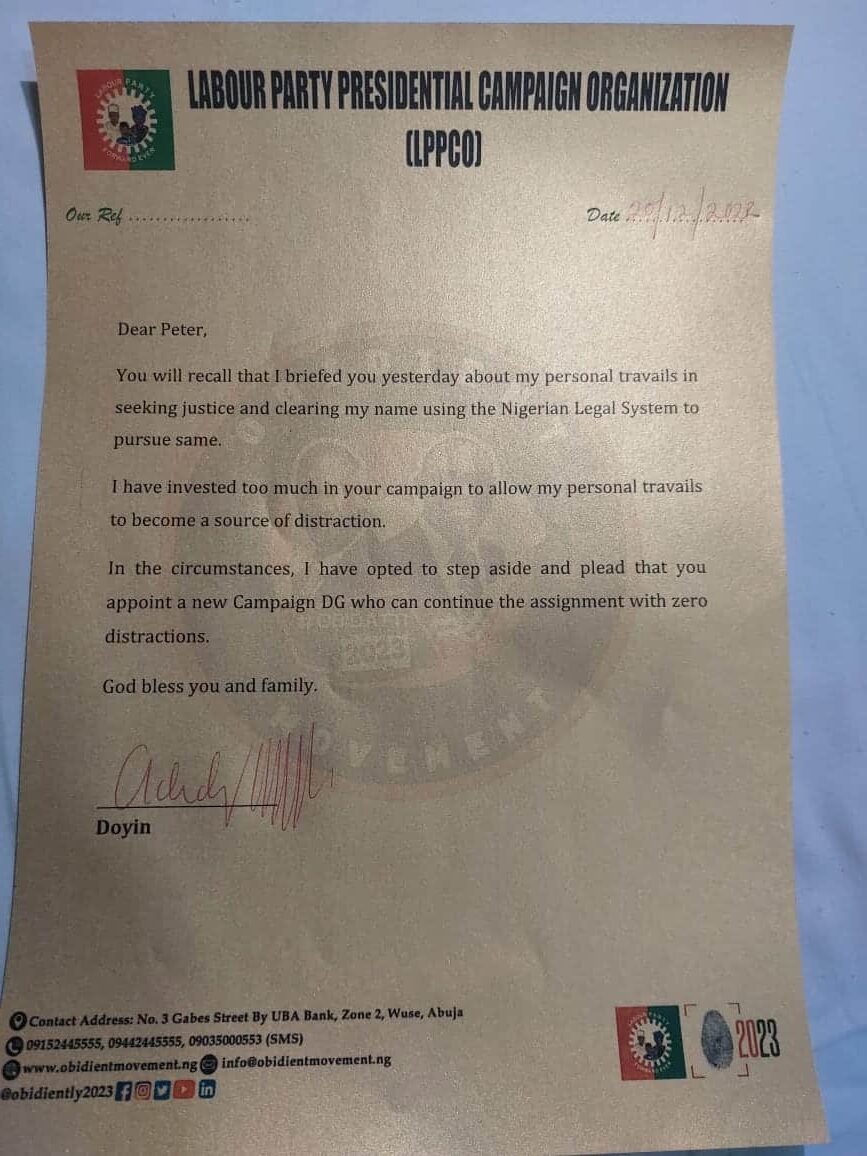 “In the circumstances, I have opted to step aside and plead that you appoint a new Campaign DG who can continue the assignment with zero distractions. God bless you and family.”