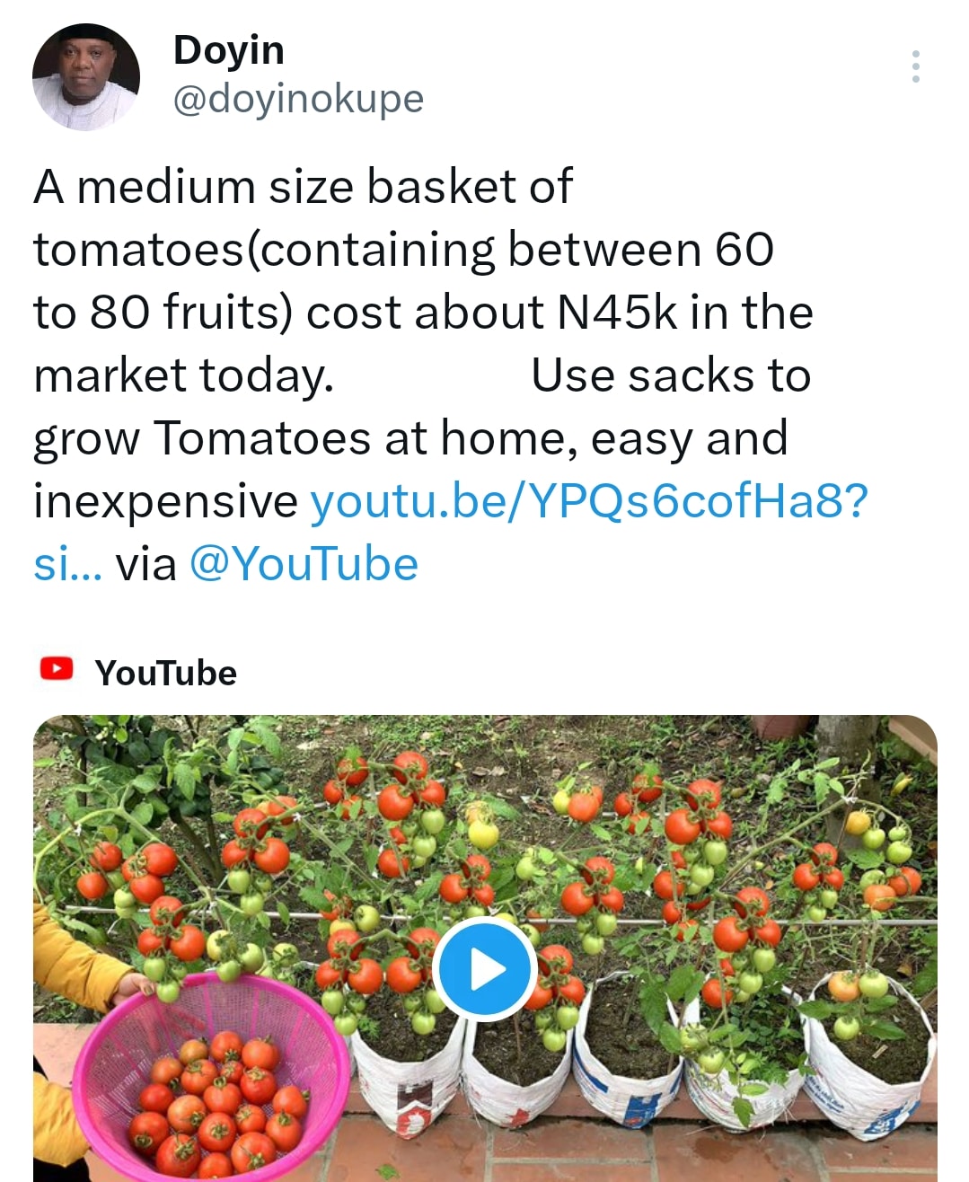 Former presidential aide, Doyin Okupe has proffered a solution of home-grown vegetables amidst the soaring prices of tomatoes.