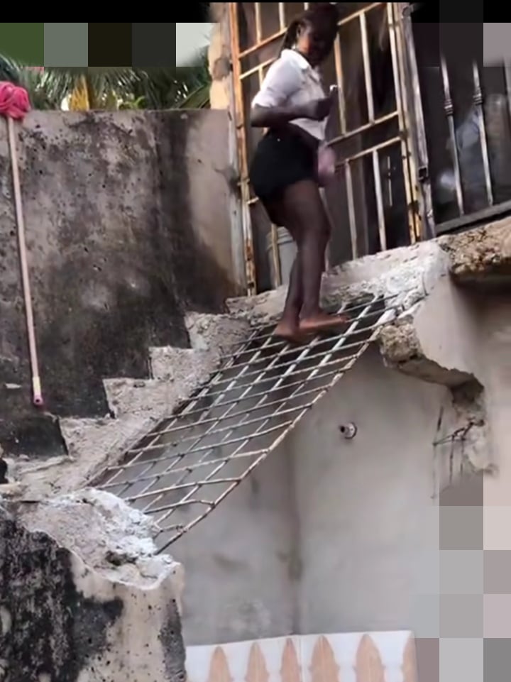 Lady laments as landlord destroys concrete staircase leading to their apartment allegedly over rent issues.