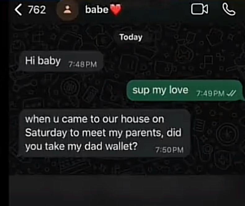 “When you came to our house on Saturday to meet my parents, did you take my dad’s wallet?”