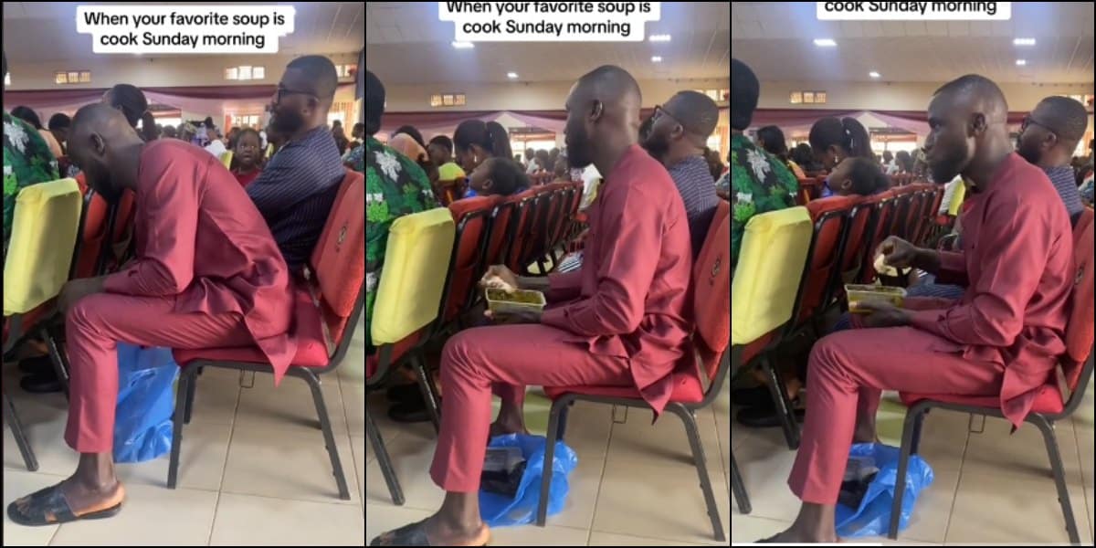 Man makes a scene at a church as a viral video captures the moment he brought out a plate of fufu and soup to eat during Sunday service.