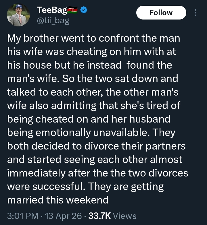 The story, shared on X, describes how a suspected cheating case took an unusual turn involving both partners discovering each other’s spouses in the same situation.