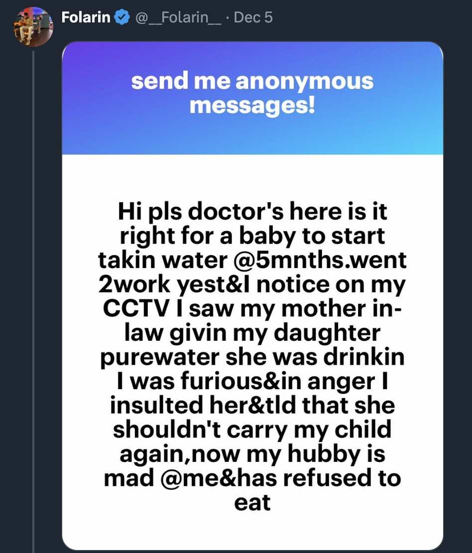 “Hi. Pls doctors here, is it right for a baby to start taking water at 5 months old? I went to work yesterday and noticed on my CCTV that my mother-in-law was giving my daughter pure water she was drinking. I was furious and, in anger, insulted her and told her that she shouldn’t carry my child again. Now my hubby is mad at me and has refused to eat.”
