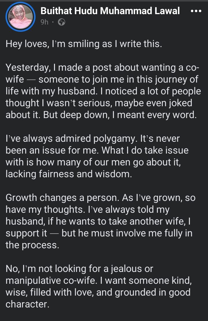 A Nigerian woman, identified as Buithat Hudu Muhammad Lawal, has sparked reactions after seeking a second wife for her husband.