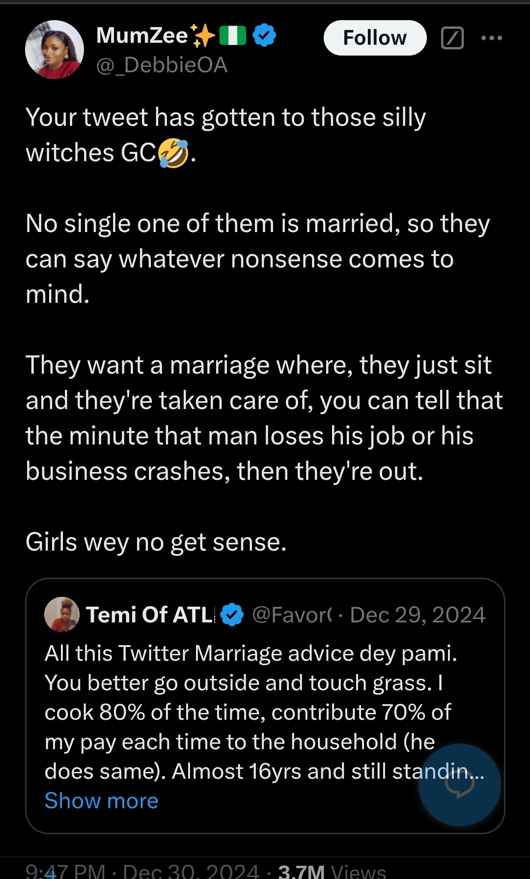 “Your tweet has gotten to those silly witches’ GC🤣. Not a single one of them is married, so they can say whatever nonsense comes to mind. They want a marriage where they just sit and are taken care of. You can tell that the minute that man loses his job or his business crashes, they’re out. Girls wey no get sense.”