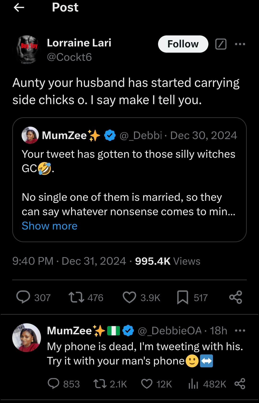 A popular Nigerian personality, Mummy Zee, has sparked a heated debate on social media after responding fiercely to a lady who alleged her husband now has a side chick.