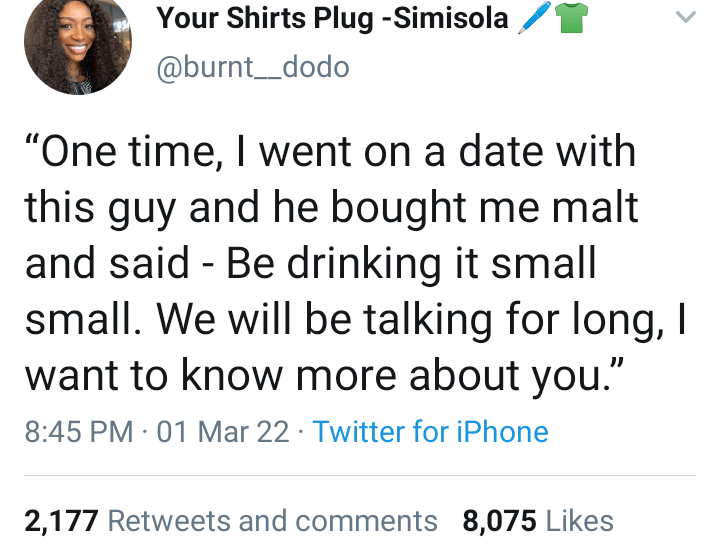 A Nigerian lady identifed with the Twitter handle @burnt_lodo has recounted how she went on a date with man who bought her a malt drink and gave her directives on how to take the drink.