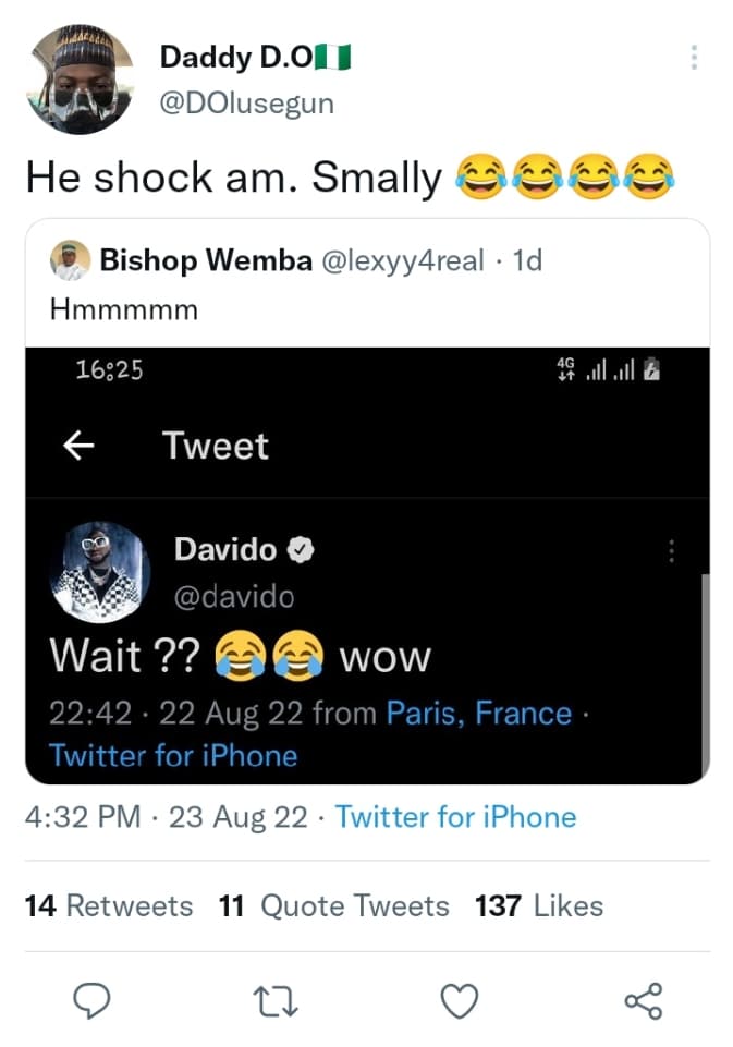 Reacting to the news, Davido expressed shock via his official Twitter account and a tweep screengrabbed his post.