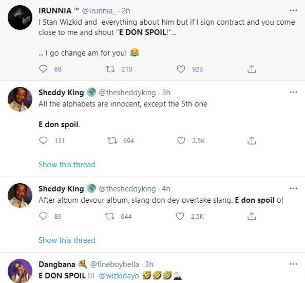 ‘E don spoil’ is the only word heard from Wizkid in the short video and has since been making rounds online as fans suggest that it might take over Davido’s catchphrase ‘E choke.’