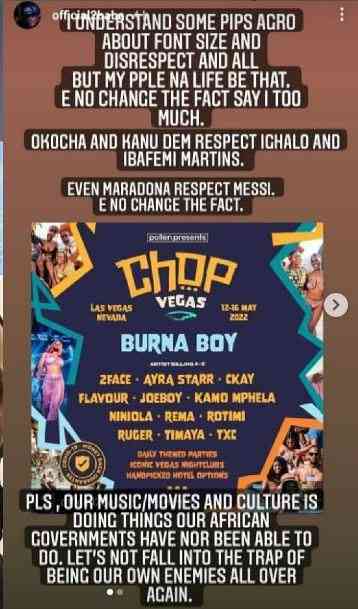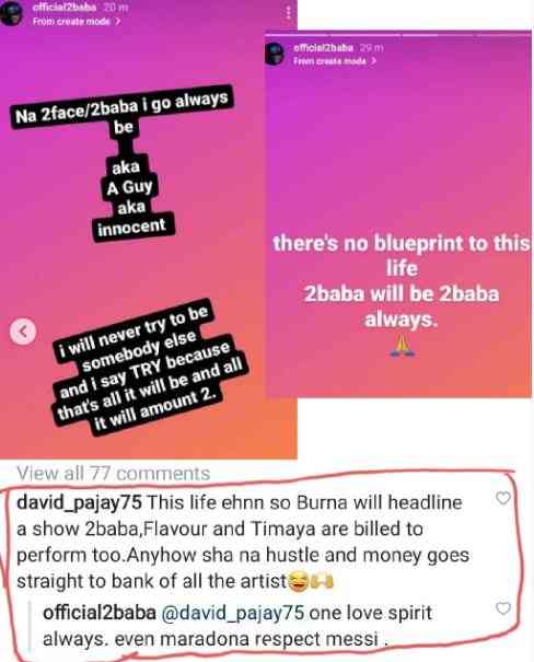An IG user had illuminated how unusual it seems for Burna Boy‘s name to dominate in show poster which had the likes of Timaya, Flavour and 2baba’s names . This observation however caught the attention of Tuface who commented extensively on it.