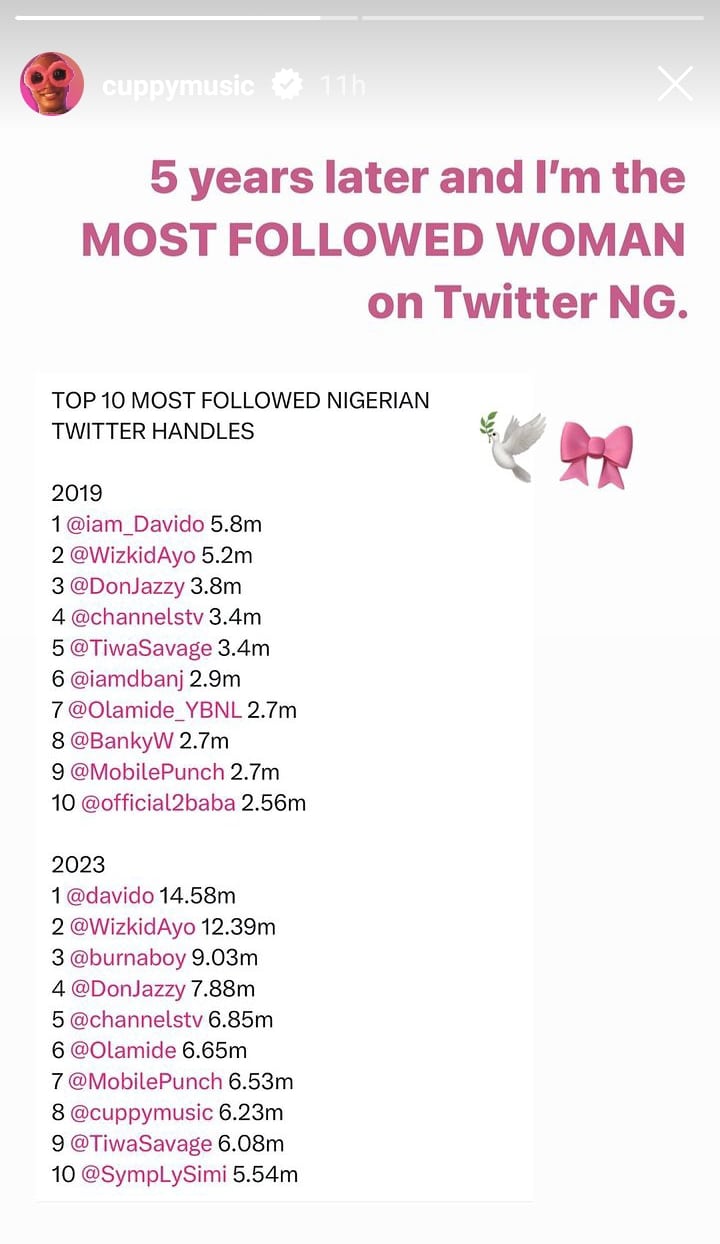 The data showed Cuppy to be the most followed Nigerian woman, with Tiwa Savage coming a close second.