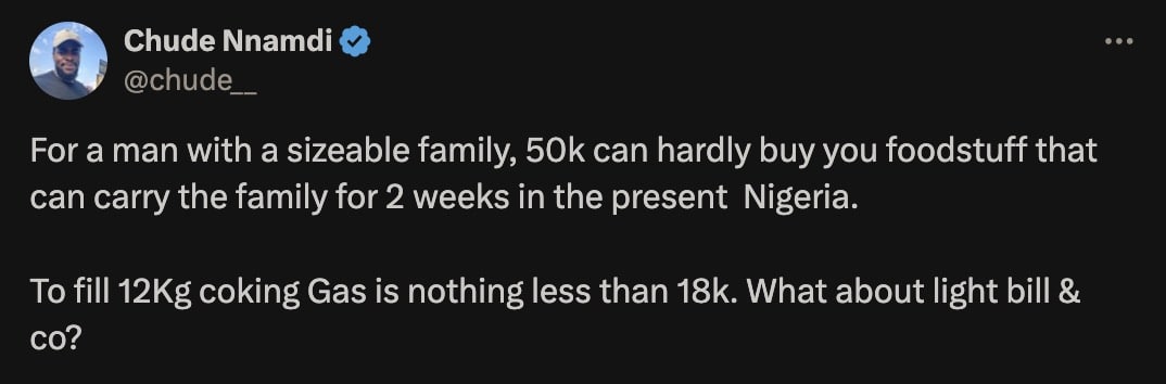 He added, “For a man with a sizeable family, 50k can hardly buy you foodstuff that can carry the family for 2 weeks in the present Nigeria.