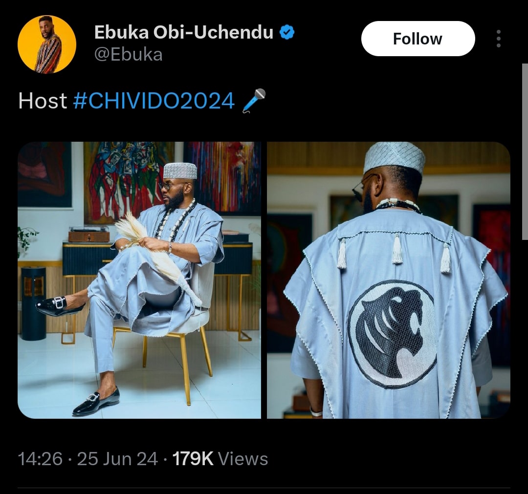 This was revealed in a fresh post he made available on social media where he captioned it: “Host #CHIVIDO2024 🎤.”