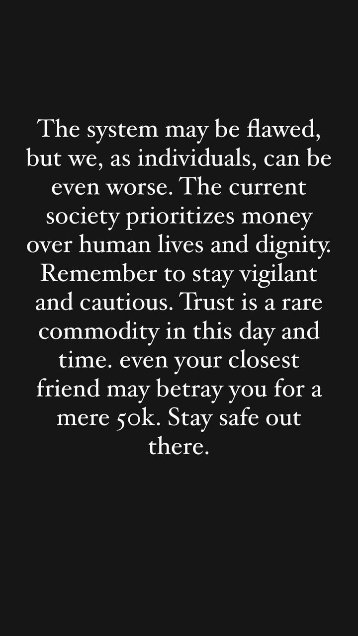 “The system may be flawed, but we, as individuals, can be even worse. The current society prioritizes money over human lives and dignity. Remember to stay vigilant and cautious. Trust is a rare commodity in this day and time. even your closest friend may betray you for a mere 50k. Stay safe out there.”