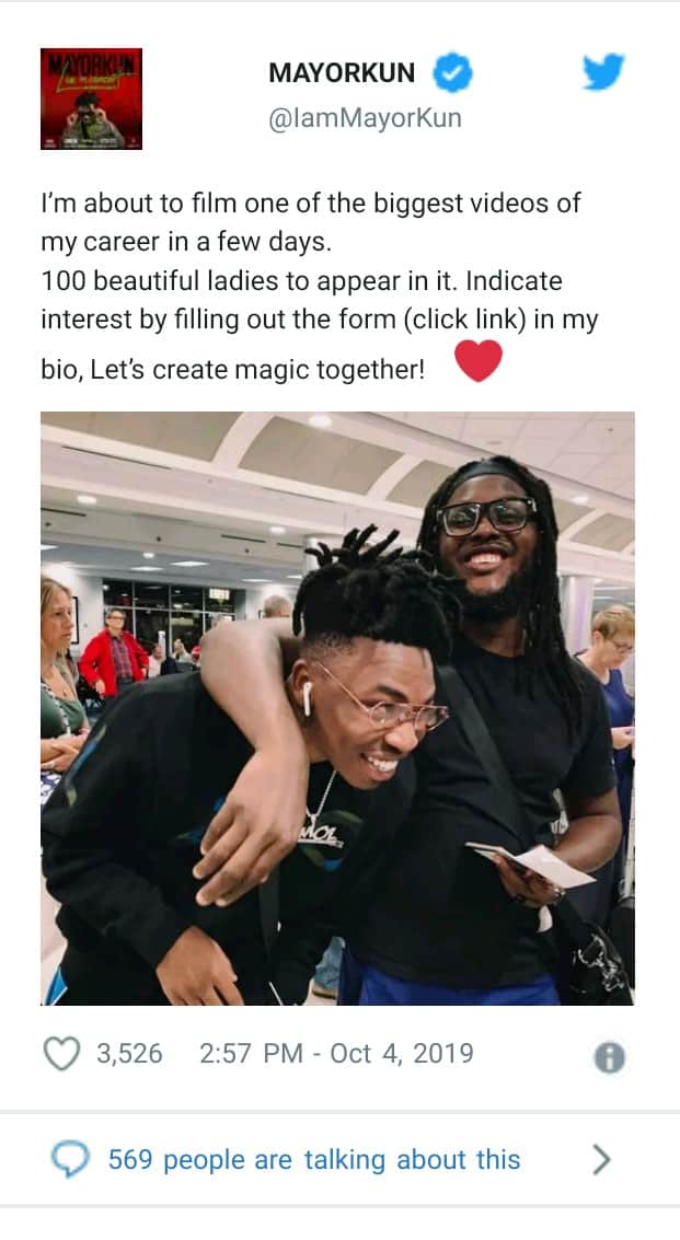 Mayorkun posted a notice on IG, revealing that he’s about to drop the biggest video in his career, and requested that 100 beautiful ladies interested in appearing in the video should fill out a form in his BIO.