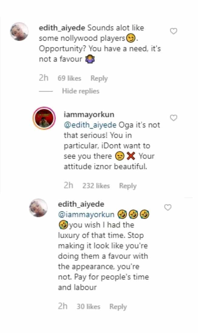 “Sounds alot like some Nollywood players. Oppurtunity? You have a need, it’s not a favour.”