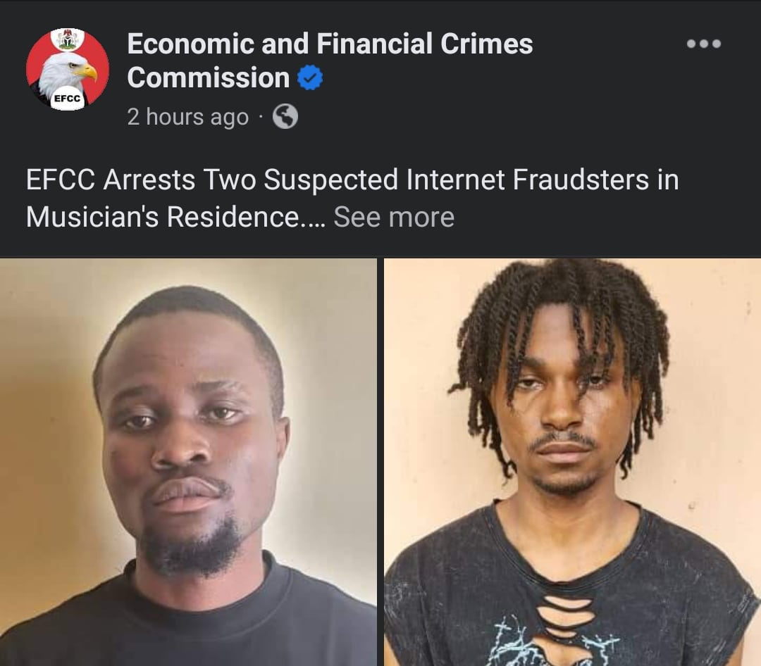 The Economic and Financial Crimes Commission, EFCC has issued a fresh statement confirming the arrest of two suspected fraudsters who were residing in the home of Nigerian singer Skales.
