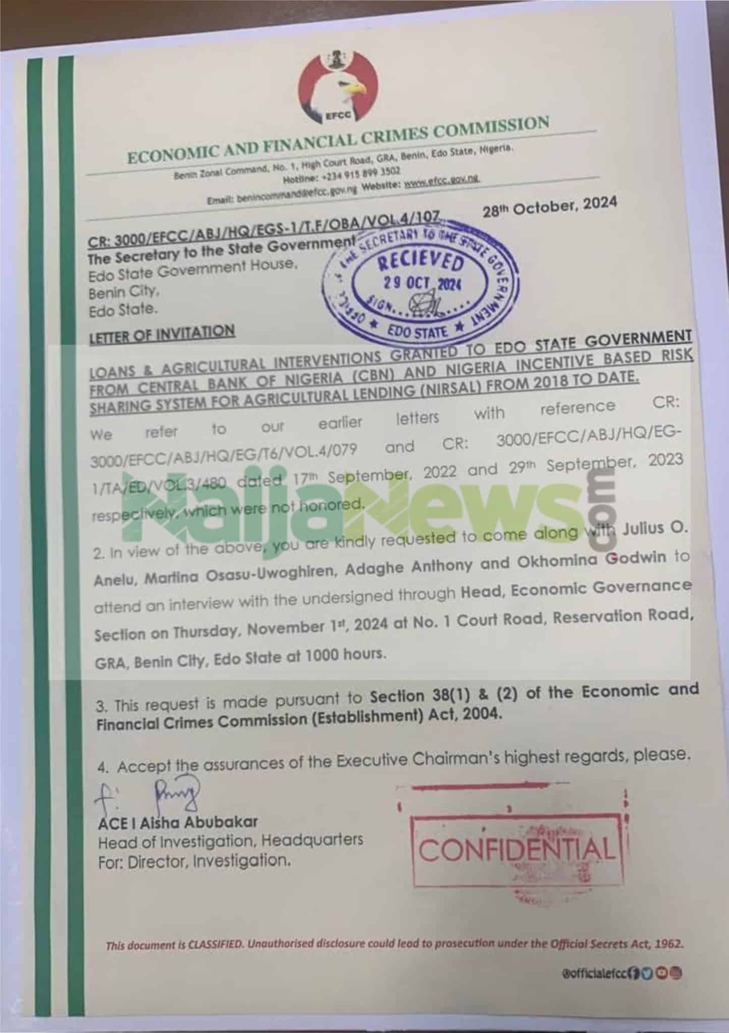A letter revealing the Economic and Financial Crimes Commission’s (EFCC) invitation of Edo State Government officials prior to their arrest and detention has surfaced.
