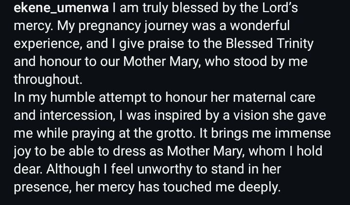 Alongside her post, Umenwa Ekene shared a video that showed her in a Catholic attire, cradling her baby bump.