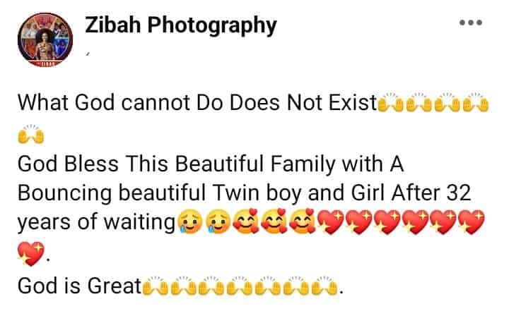 “What God cannot Do Does Not Exist. God Bless This Beautiful Family with A Bouncing beautiful Twin boy and Girl After 32 years of waiting🥲🥲🥰🥰🥰💖💖💖💖💖💖💖. God is Great🙌🙌🙌🙌🙌🙌🙌.”