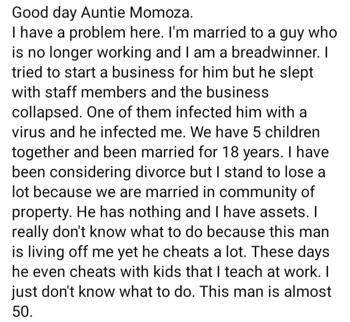 I have a problem here. I’m married to a guy who is no longer working and I am a breadwinner. I tried to start a business for him but he slept with staff members and the business collapsed. One of them infected him with a virus and he infected me. We have 5 children together and been married for 18 years. I have been considering divorce but I stand to lose a lot because we are married in community of property. He has nothing and I have assets. I really don’t know what to do because this man is living off me yet he cheats a lot. These days he even cheats with kids that I teach at work. I just don’t know what to do. This man is almost 50.”