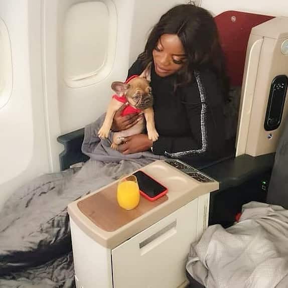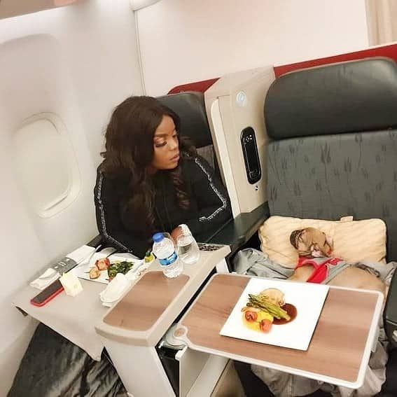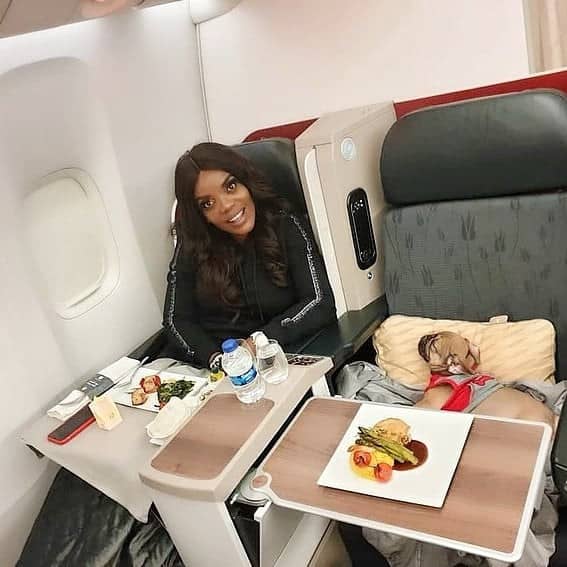 Nollywood actress, Empress Njamah shared photos of herself and her dog flying business class today October 24th.