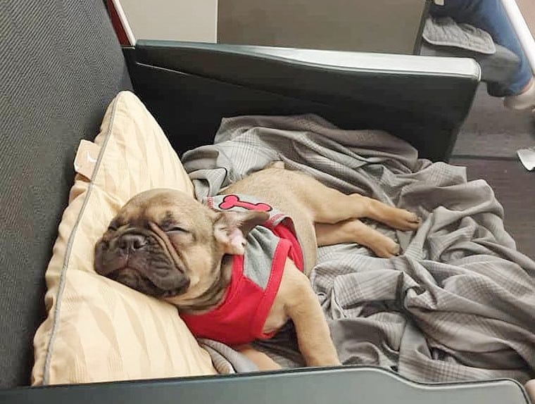 ”Flying back in #style with my FRENCH BULLDOG…. #experience dog lovers”.