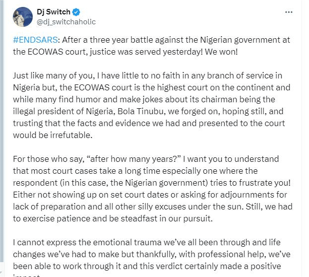“#ENDSARS: After a three-year battle against the Nigerian government at the ECOWAS court, justice was served yesterday! We won!