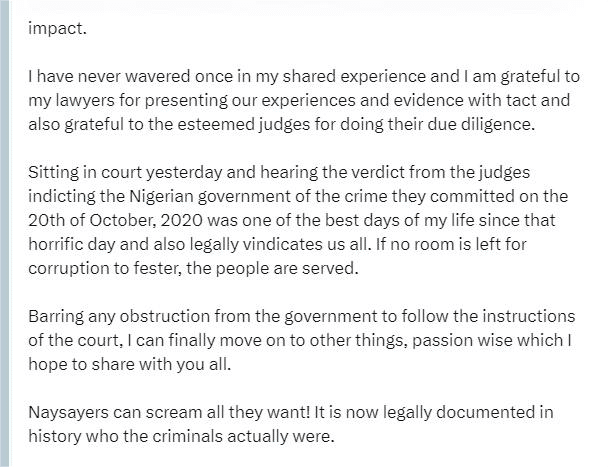 “Sitting in court yesterday and hearing the verdict from the judges indicting the Nigerian government of the crime they committed on the 20th of October, 2020 was one of the best days of my life since that horrific day and also legally vindicates us all. If no room is left for corruption to fester, the people are served.