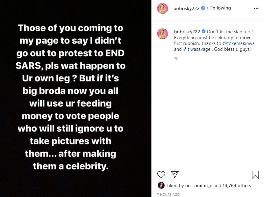 Some Nigerians went on Bobrisky’s Instagram page to slam him for not joining the celebrities in the protest. He reacted saying;