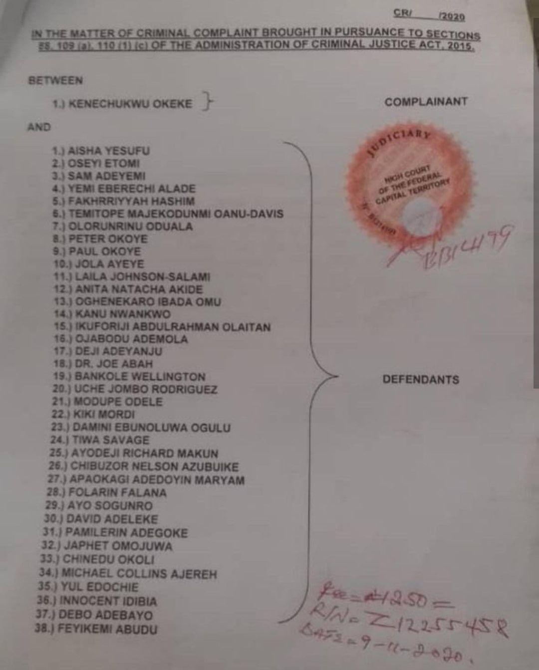 Also dragged before the Federal Capital High, FCT, High Court is Aisha Yesufu,Deji Adeyanju, Folarin Falana also known as Falz, Yemi Alade among others.