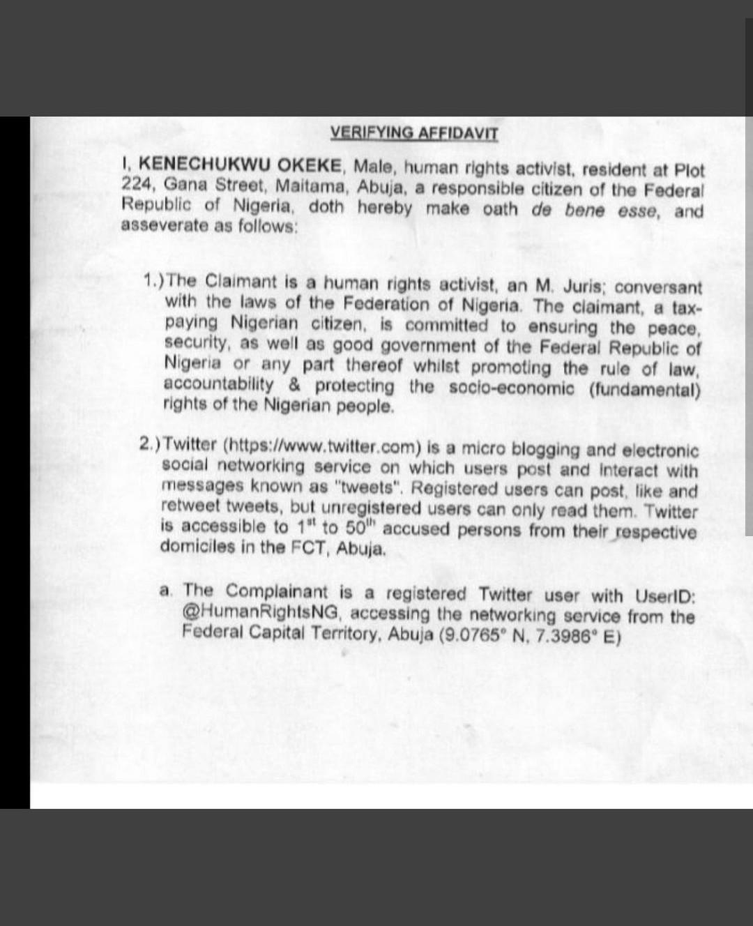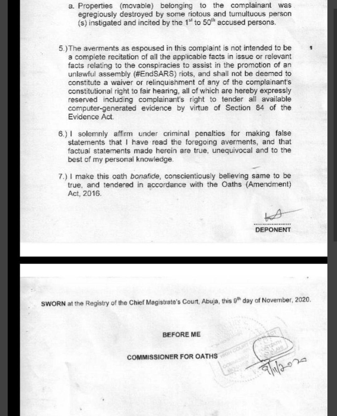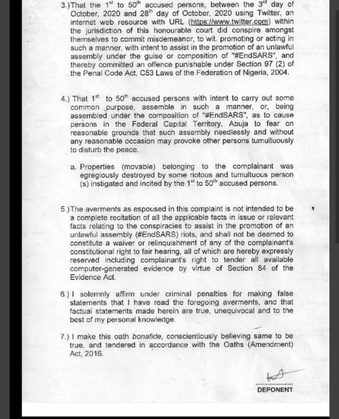 The activist said between October 28 and October 30, 2020 the defendants used their twitter accounts to conspire amongst themselves to “commit misdemeanor, to wit promoting or acting in such a manner with intent to assist in the promotion of an unlawful assembly under the guise or composition of #EndSARS”.