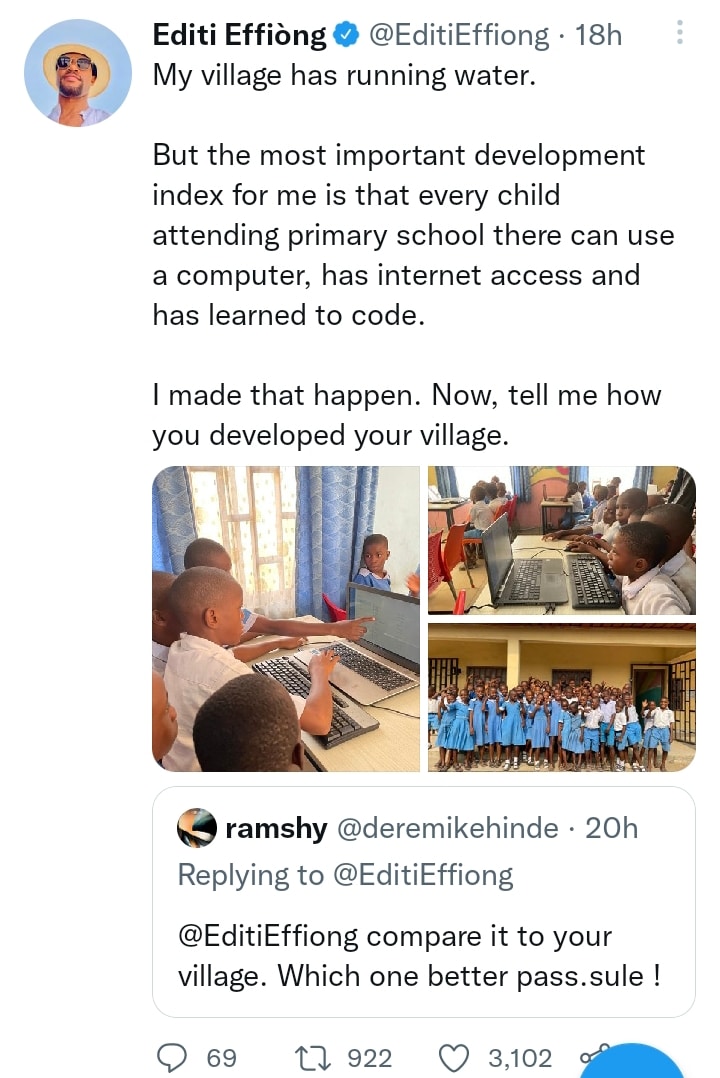 He replied by telling the troll that he had taught kids in his village to use a computer as well as how to code and then challenge the troll to show what he has done in his own village.
