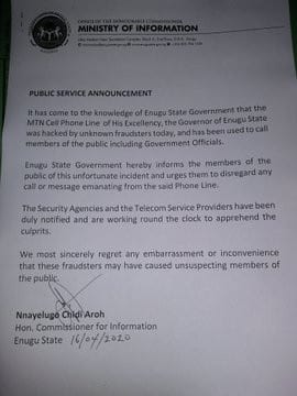 “It has come to the knowledge of Enugu State Government that the MTN Cell Phone Line of His Excellency, the Governor of Enugu State was hacked by unknown fraudsters today, and has been used to call members of the public including Government Officials.