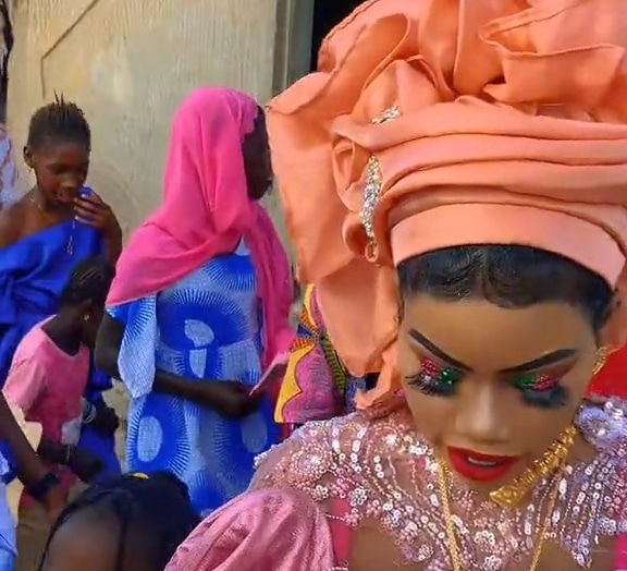 A Nigerian woman dressed as a bride has captured the attention of TikTok users as she was seen putting on heavy makeup and being escorted to her wedding event by her bridesmaids.