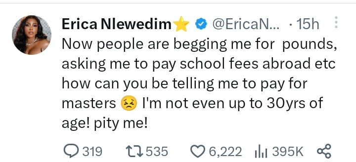Now people are begging me for pounds, asking me to pay school fees abroad etc how can you be telling me to pay for masters 😣 I’m not even up to 30yrs of age! pity me!”