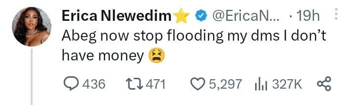 Reality star, Erica Nlewedim cries out as fans storm her DM with various requests after her colleague, Cross gave a hint about her wealth.
