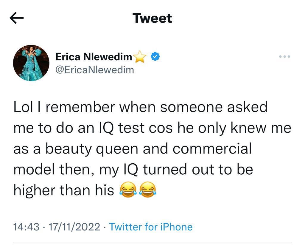 Erica has come under fire multiple times for being “just a pretty face”. The actress takes to Twitter today, November 17 to narrate how a man asked her to take an IQ test to prove that she was more than “a beauty queen and commercial model”.
