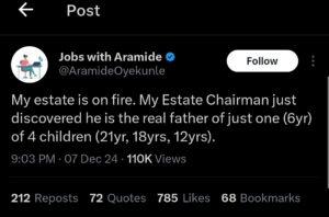 The post read: “My estate is on fire. The Estate Chairman just discovered he is the real father of only one (6yr) of his 4 children (21yr, 18yrs, 12yrs).”