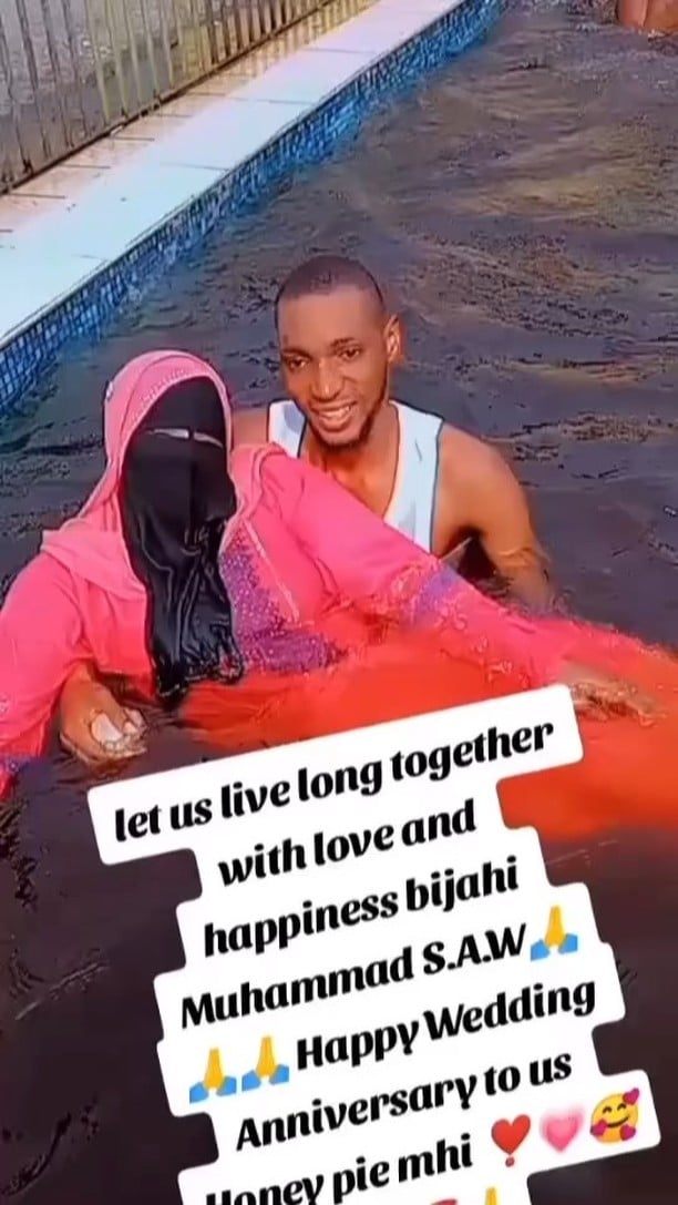 In the viral video, the man is seen behind his niqobite wife and snatching her by the back while they enjoy themselves in the pool.
