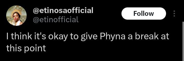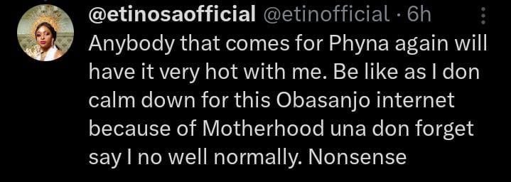 Etinosa has sent a public warning to Phyna’s critics, telling them to seize all criticisms against the reality star or have her to contend with.