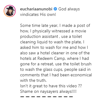 Eucharia Anunobi took to Instagram to narrate how she saw a cleaner in one of the hotels at a church Camp, using a toilet brush to wash glass cups.