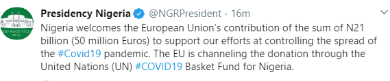 ”Nigeria welcomes the European Union’s contribution of the sum of N21 billion (50 million Euros) to support our efforts at controlling the spread of the #Covid19 pandemic. The EU is channeling the donation through the United Nations (UN) #COVID19 Basket Fund for Nigeria” the Presidency’s Twitter handle wrote online
