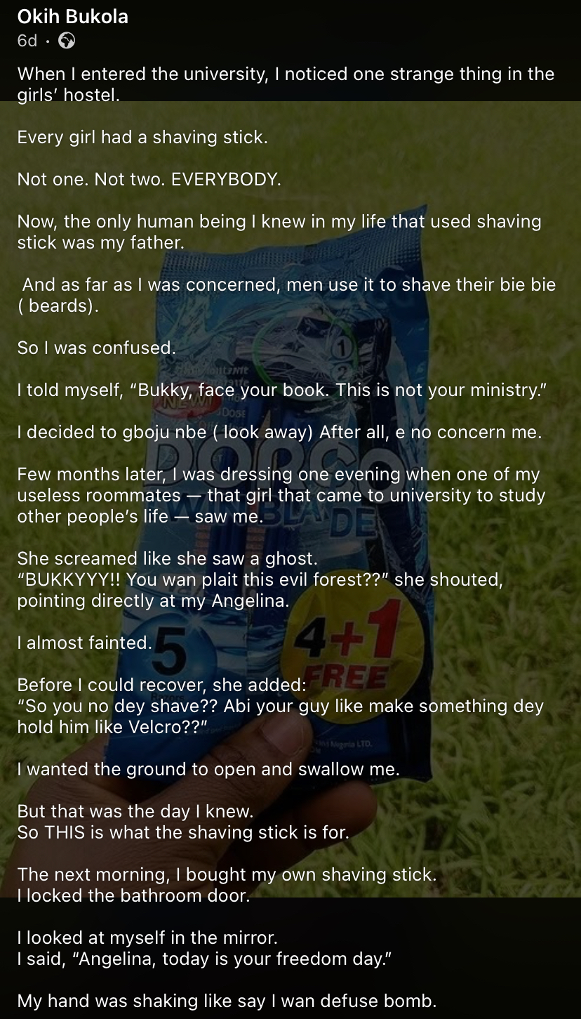 According to Bukola, when she entered university, she noticed every girl in the hostel had a shaving stick.